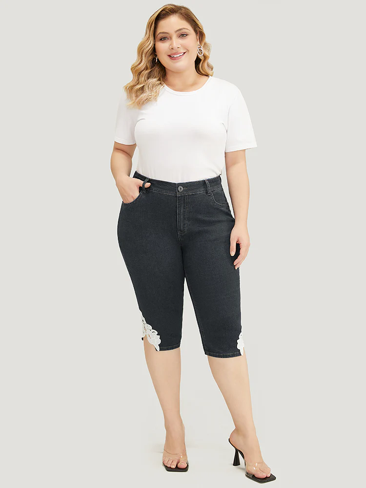 Very Stretchy High Rise Medium Wash Guipure Lace Knee Denim Shorts
