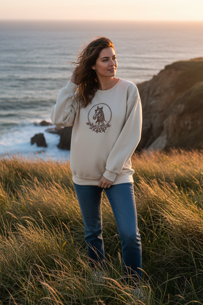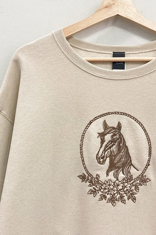 LONG SLEEVE CREW-NECK EMBROIDERED HORSE PORTRAIT OVERSIZED WESTERN GRAPHIC SWEATSHIRT TOP